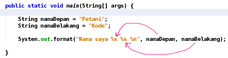 System.out.format("Nama saya %s %s %n", namaDepan, namaBelakang);